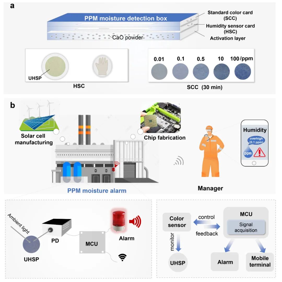 基于UHSP對濕度的高靈敏度和明顯的顏色變化,通過集成標(biāo)準(zhǔn)色卡(SCC)、基于UHSP的濕度傳感器卡(HSC)和活化層(即CaO粉末),可開發(fā)便攜式ppm濕度檢測盒(圖5a)。通過對比HSC與SCC的響應(yīng)狀態(tài),實現(xiàn)環(huán)境中超低 (0.01-100 ppm) 濕度的肉眼視覺檢測。此外,將UHSP與顏色傳感器、微控制器單元 (MCU)、報警器裝置和智能終端 (如手機)集成在一起,可以開發(fā)出多功能的ppm級濕度監(jiān)測和報警裝置(圖5b)。一旦測試環(huán)境中的水分含量達到或超過預(yù)設(shè)的報警濕度值,就會迅速觸發(fā)報警裝置。現(xiàn)場和遠程管理人員可以通過報警聲或智能終端及時得到信息反饋,實現(xiàn)高效的遠程控制。PPM級濕度報警器有望在芯片封裝、集成電路制造、鋰離子電池/太陽能電池研發(fā)、航空探索等領(lǐng)域發(fā)揮重要作用。